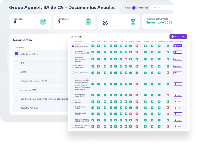 SmartRep te ofrece un panel de control 100% enfocado a cumplimiento, para que de manera rápida puedas visualizar el estado de la documentación, alertas y porcentajes de validación.